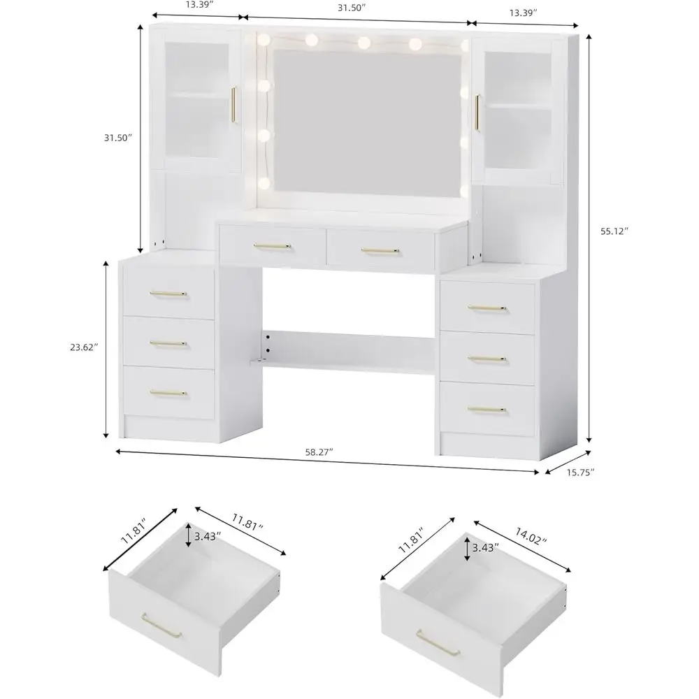 58.3in Vanity Desk with Mirror Charging Station 8 Drawers 2 Cabinets Bedroom Makeup Table, Customized
