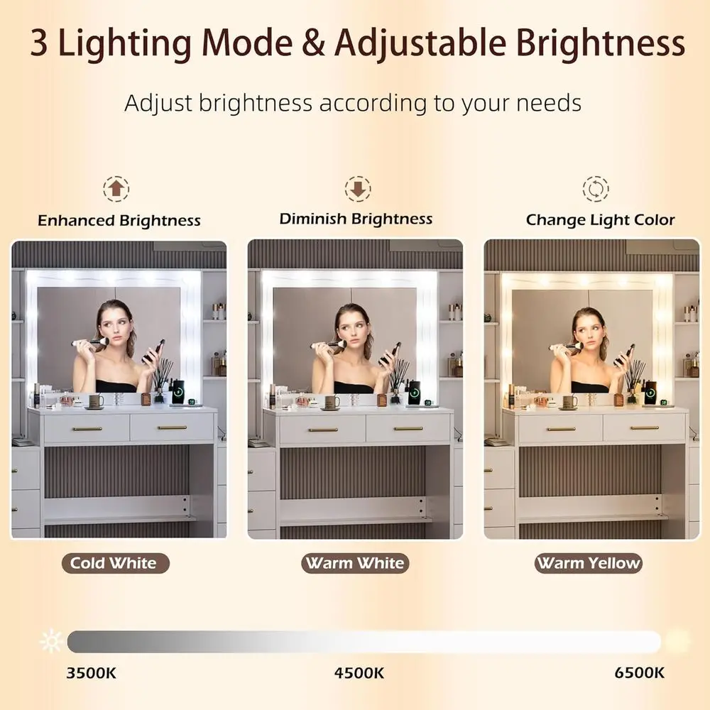 【Large Mirror with 10 Hollywood Light Bulbs】This modern makeup vanity features a large mirror surrounded by 10 hollywood-style light bulbs. It can be switched 3 different color temperature (warm yellow, warm white, and cool white), providing you with the perfect ambiance for your makeup and daily skin care. And the brightness can be adjusted by pressing the button to meet different brightness needs, creating the perfect lighting when applying makeup or hair styling, and avoiding blinding light.