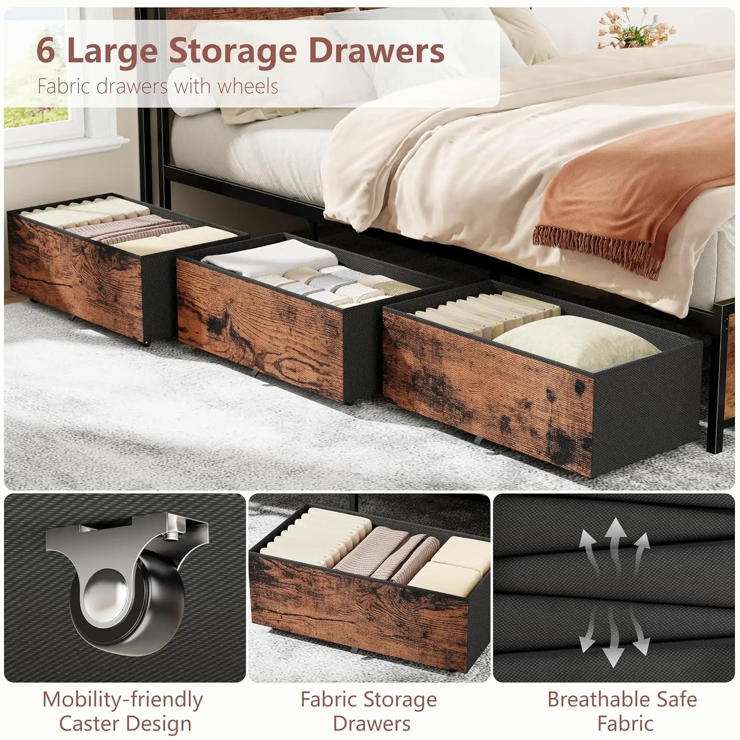 【6 Storage Drawers】Bed frame full size with 6 fabric drawers on pulleys, store extra bedding, clothing, or seasonal items for keeping your bedroom organized. The pulleys on the drawers allow you to effortlessly pull out drawers and also protects the floor from scratches.
